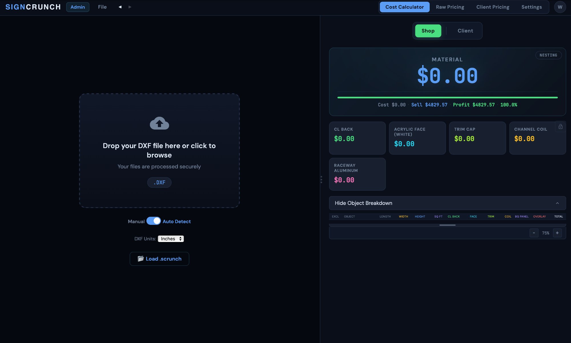 You're not losing money — you just can't see your floor. A shop at $15/inch doesn't know if they can go to $12 to beat a competitor. SignCrunch shows the floor. Everything above it is your decision.