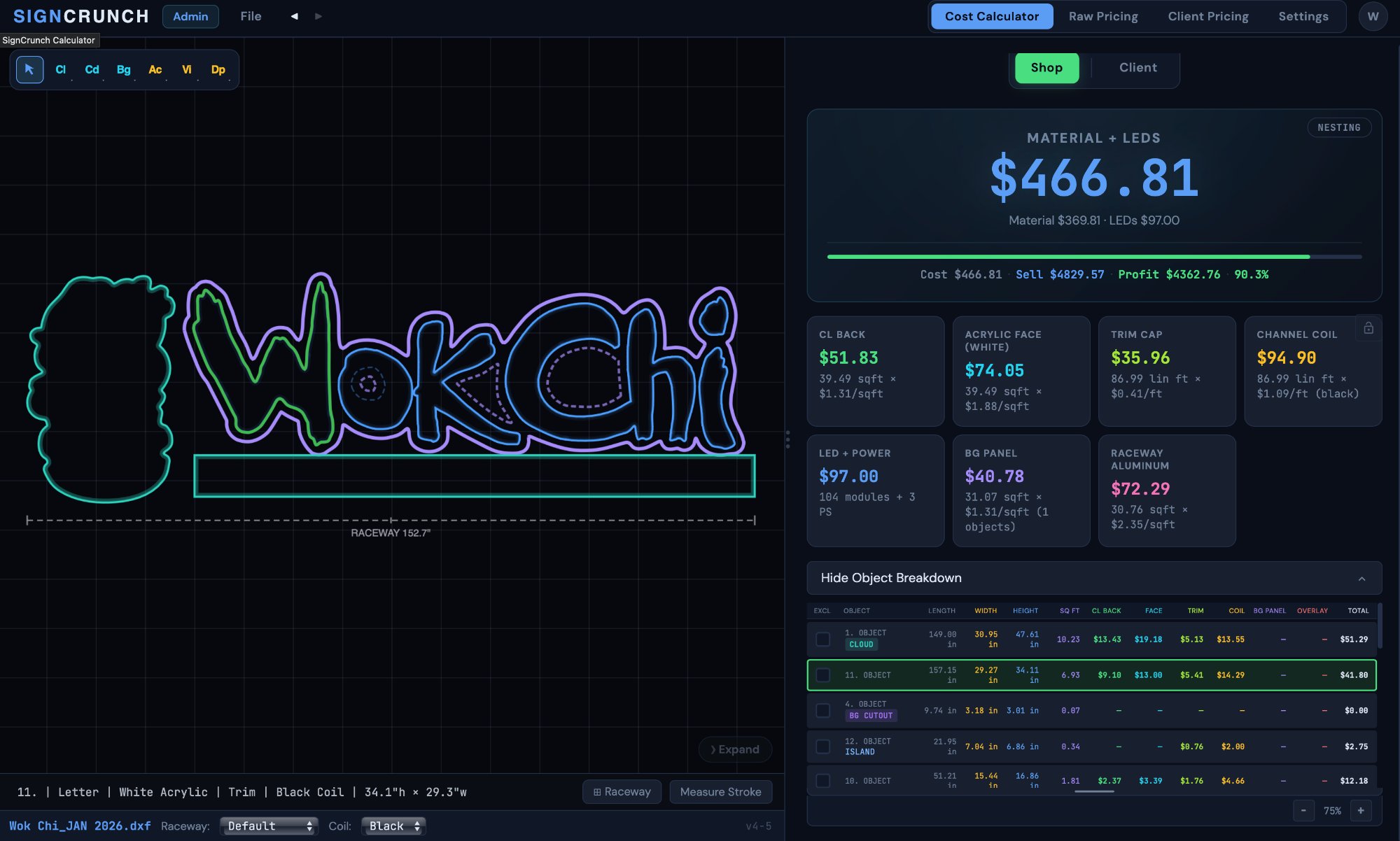 Shop report shows every material cost per letter. Client proposal shows only your sell prices — material costs stay hidden.