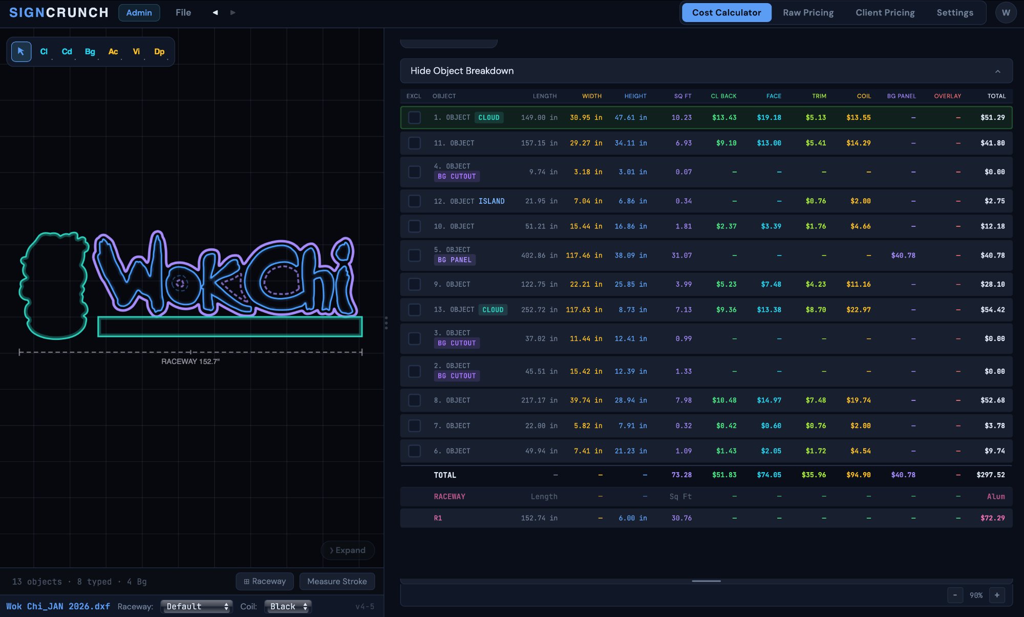 "I've been in this industry for 20+ years and always used a formula in my head — I had an idea on real cost, but to do it precisely was time-consuming. With a shop to run and new jobs entering the pipeline every day, you can never find the time to calculate each letter down to the trim without losing hours."