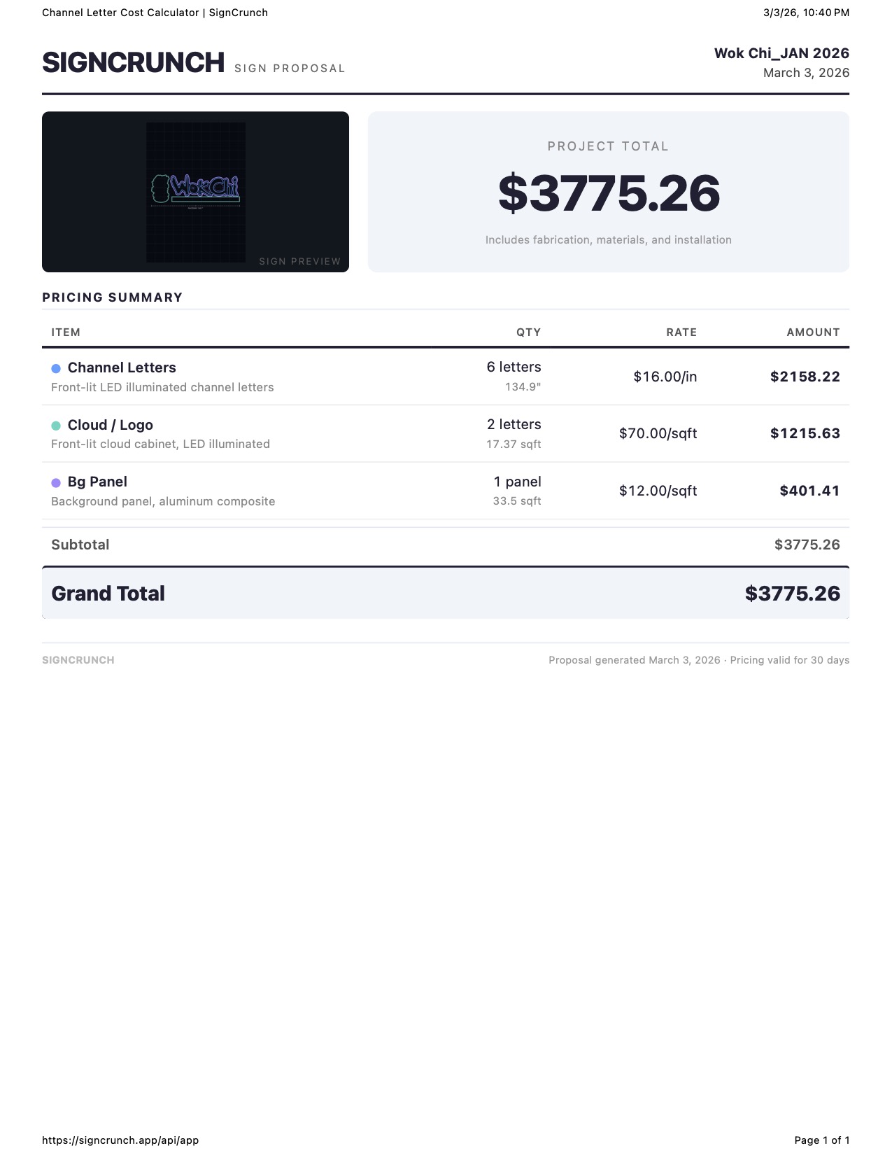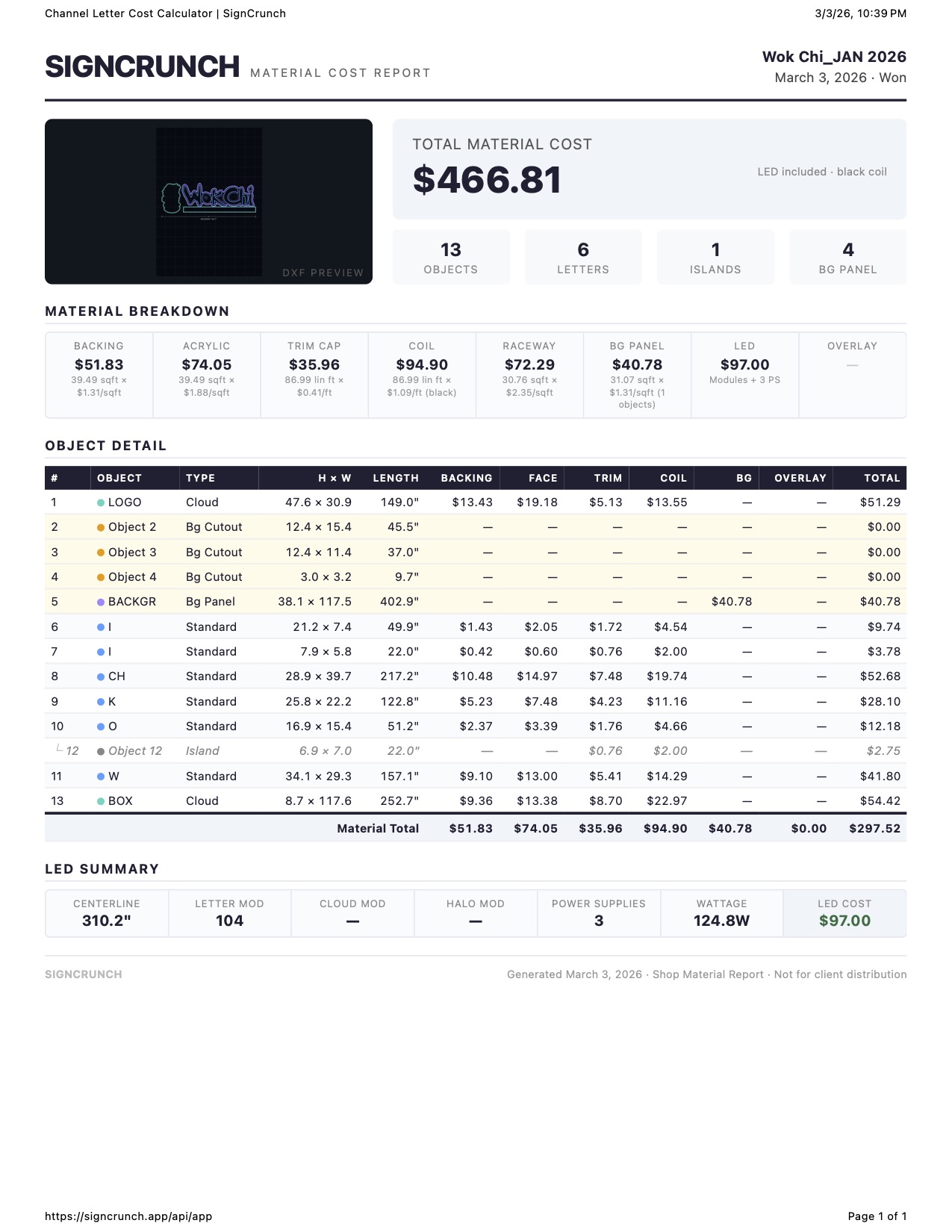 Shop print — full material breakdown with DXF preview, per-letter cost table with all material columns, category totals, and LED summary. This is your internal cost reference.