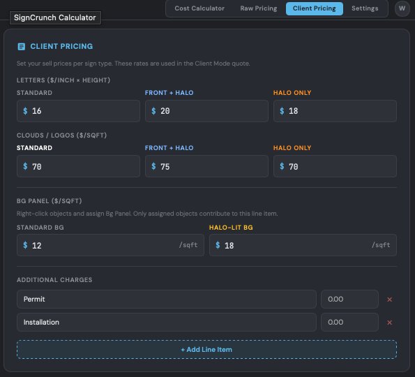 Below the per-inch rates, you can add custom line items for anything beyond the sign itself — permits, installation, electrical, engineering, shipping, or any other charge. Click + Add Line Item to add a new row. Each row has a name and dollar amount. These appear on the client print template and are included in the grand total.