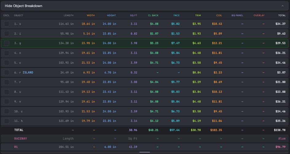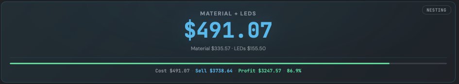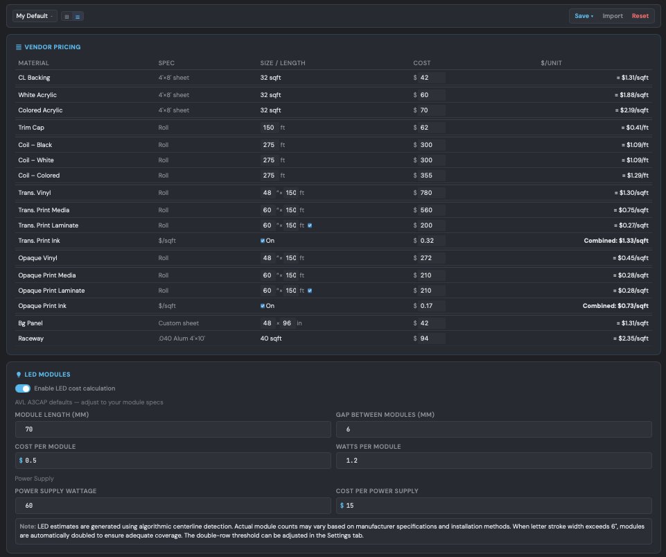 The big number at the top of the right panel — this is the sum of all material costs for your entire sign set. This is your floor: the absolute minimum cost of raw materials before labor, overhead, or profit. Everything you quote above this number is margin you're choosing, not guessing.