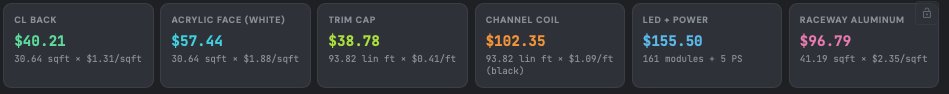 Below the total, you'll see the material breakdown cards — one for each material category: CL Back (backing), Acrylic Face, Trim Cap, Channel Coil, LEDs, Background Panel, overlays, and Raceway. Each card shows the total cost, quantity used, and per-unit price.