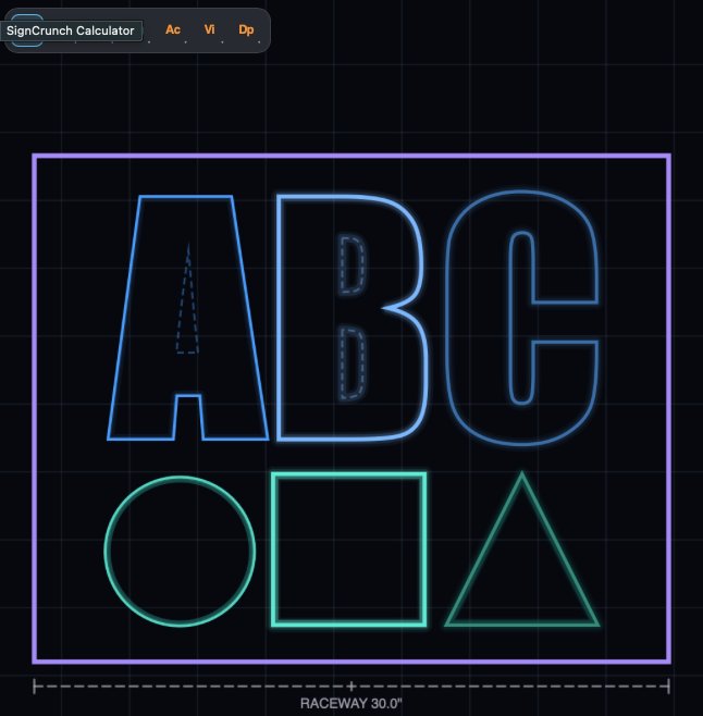 ⊞ Raceway — enters custom raceway drawing mode. Click two points on the canvas to measure an exact raceway length. You can draw multiple raceways for complex sign layouts. Set the Raceway dropdown to "Custom" to use your drawn measurements instead of the automatic calculation.