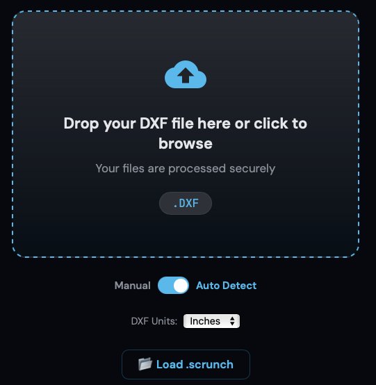 Downloads a .scrunch project file to your computer containing your DXF data, all material assignments, excluded paths, vendor prices, client rates, custom line items, and every setting. Load it later to resume exactly where you left off.